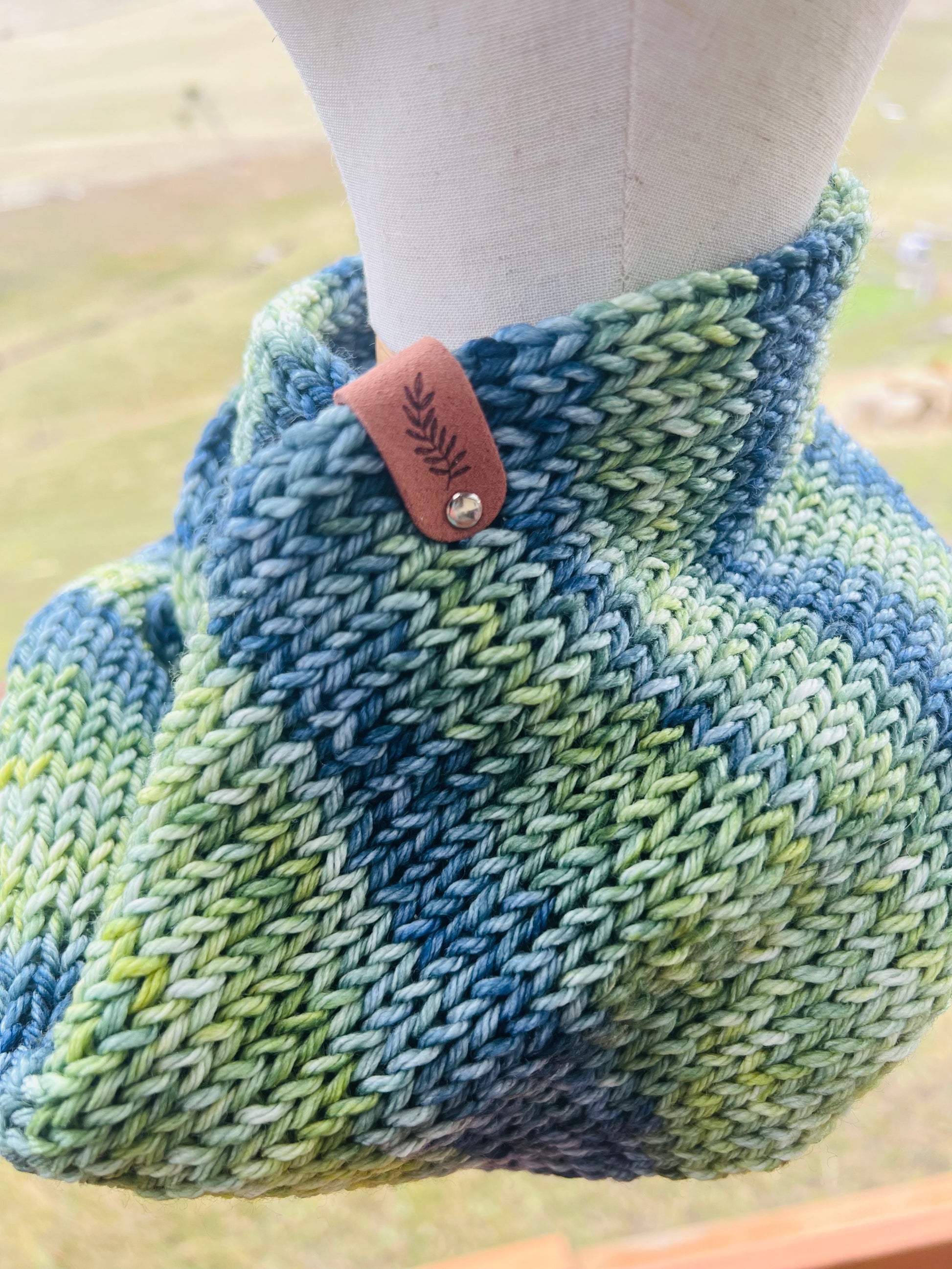 This scarf has been knitted with hand dyed yarn, in Tasmania, Australia and has our unique leather label.