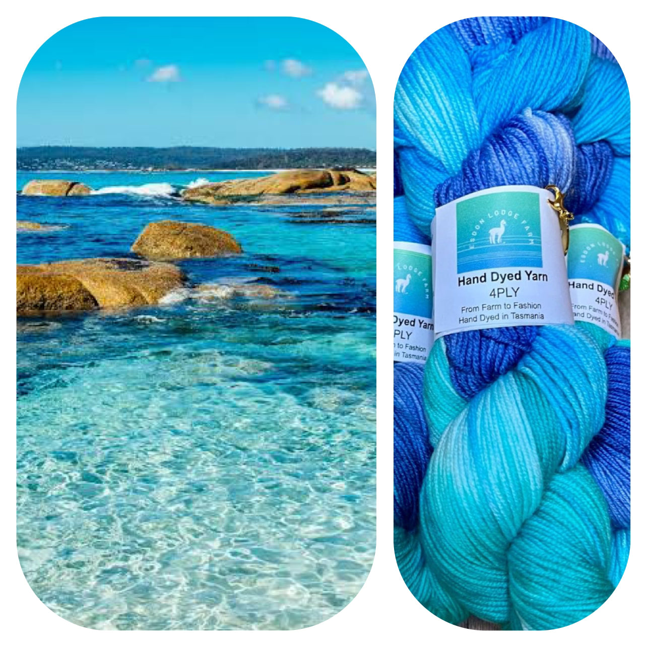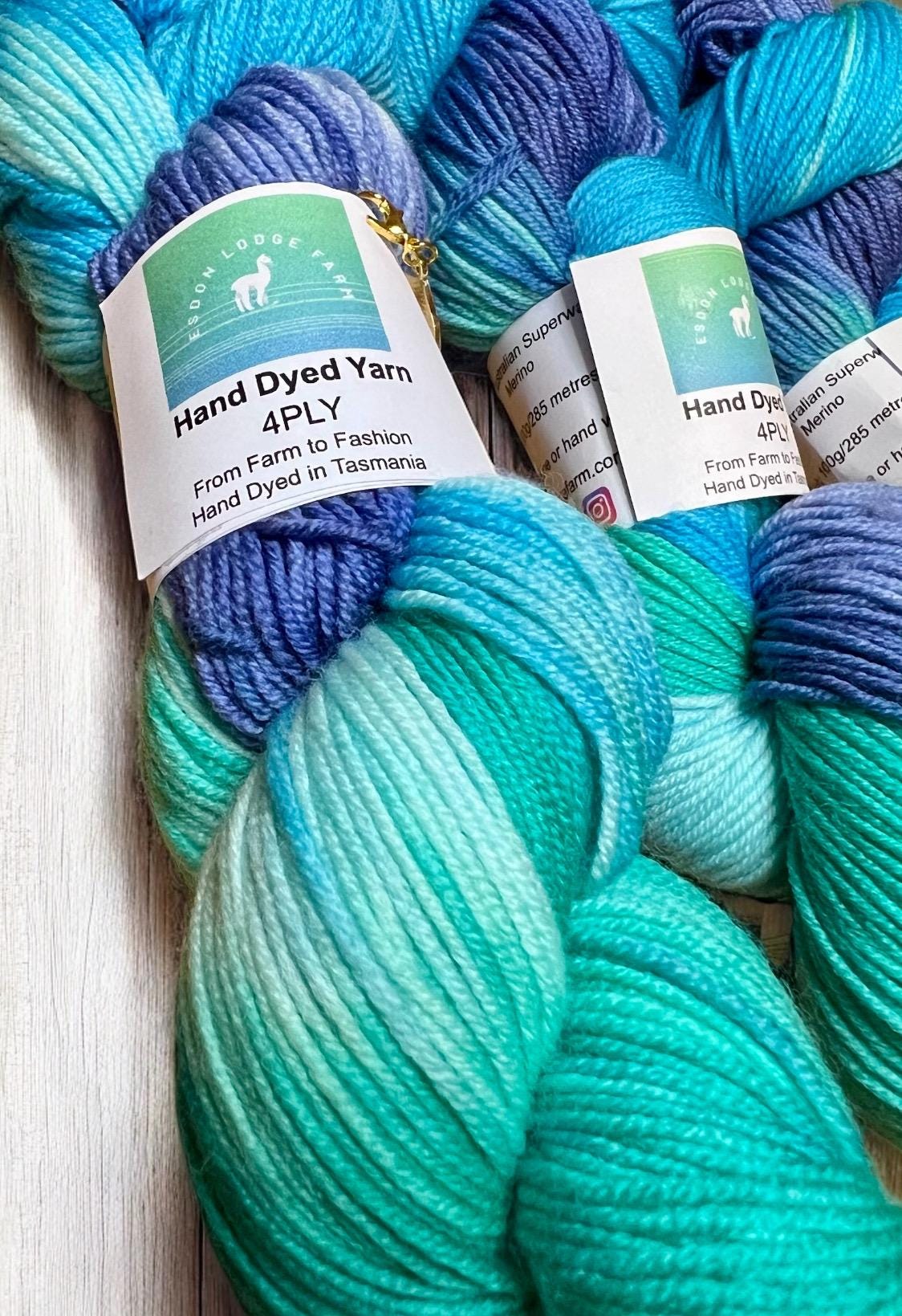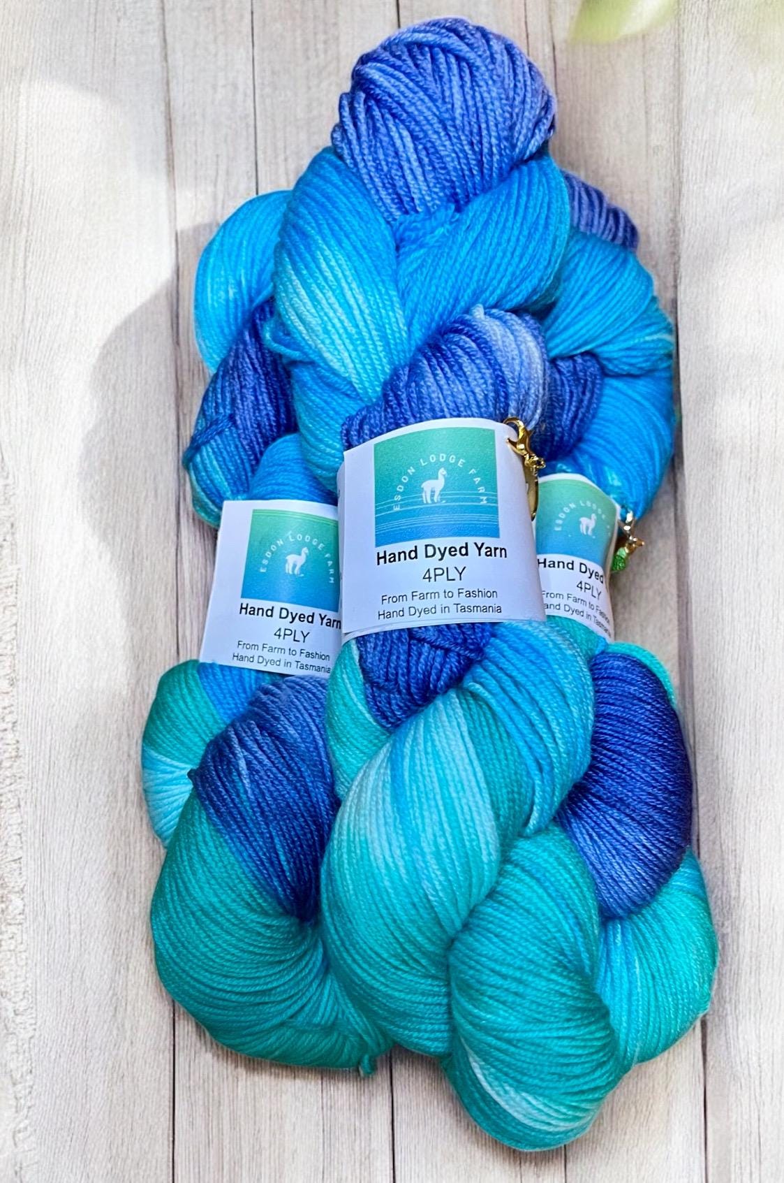 Bicheno Blue is a blend of rich Blues and greens each skein is hand dyed in my studio on our small farm in Bagdad, Tasmania.