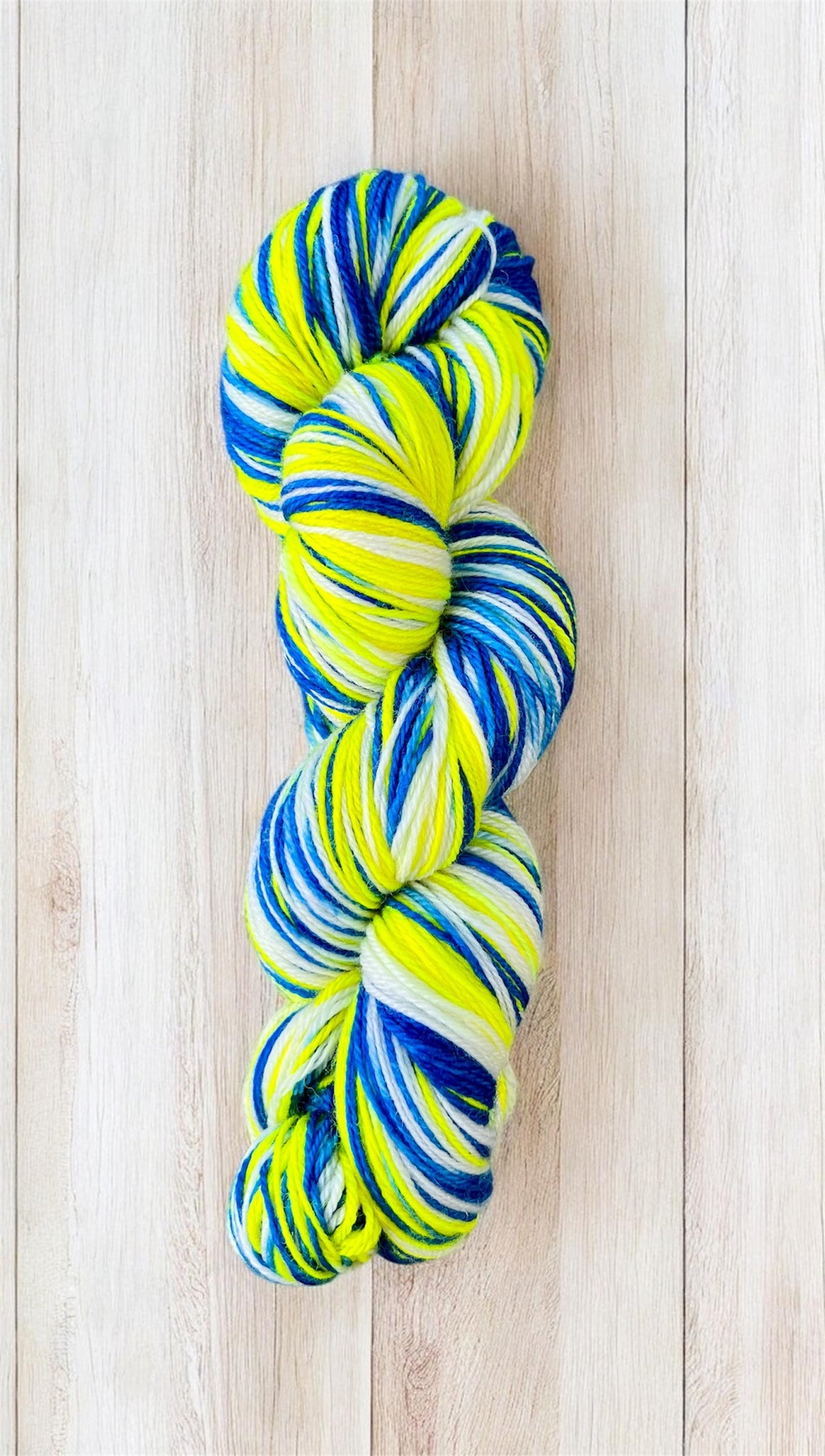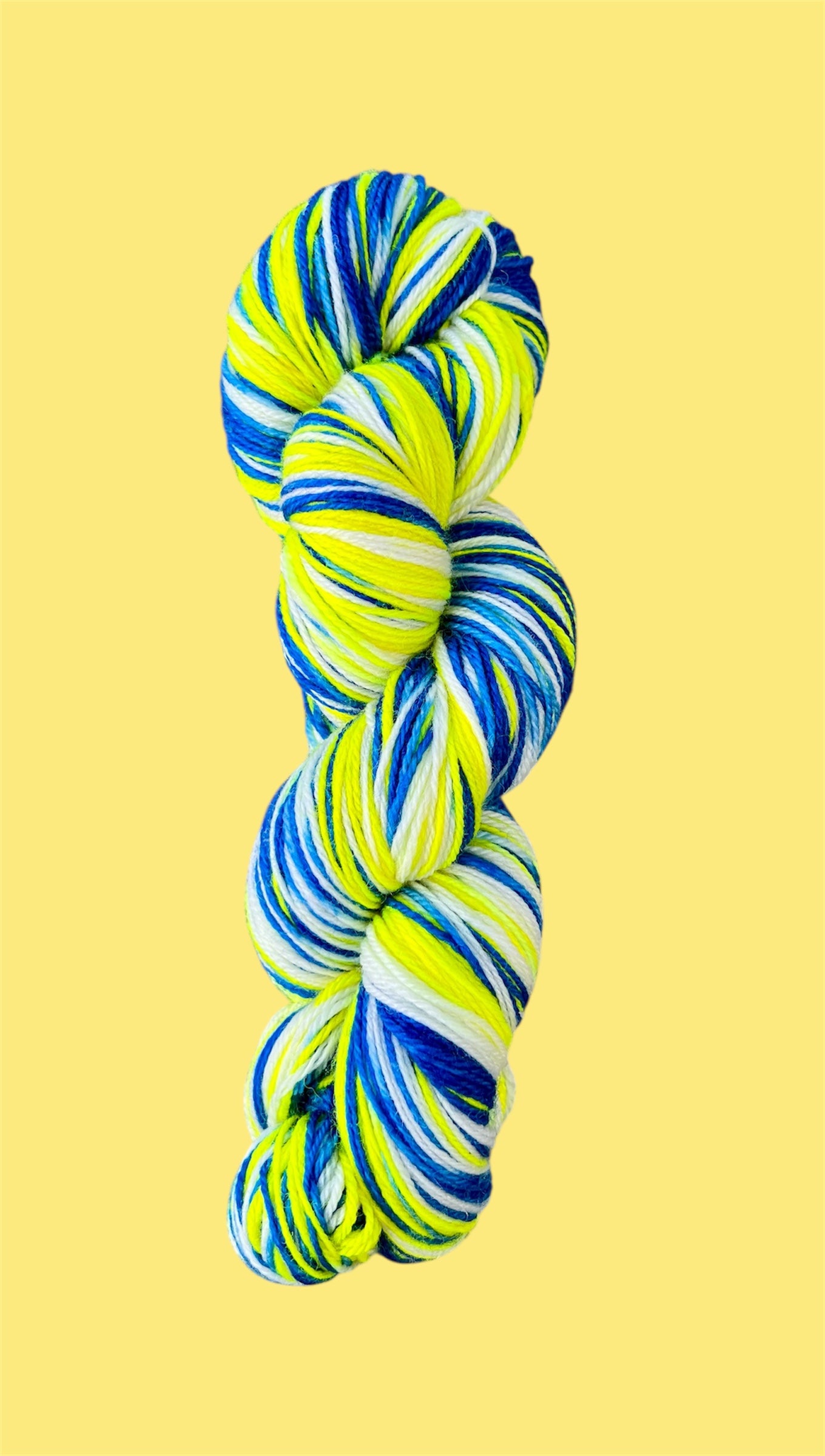 Starry Starry Night , brings together bright yellow, white and navy blue and is inspired by the Vincent Van Gogh painting , each skein is hand dyed on our small farm in Bagdad, Tasmania.