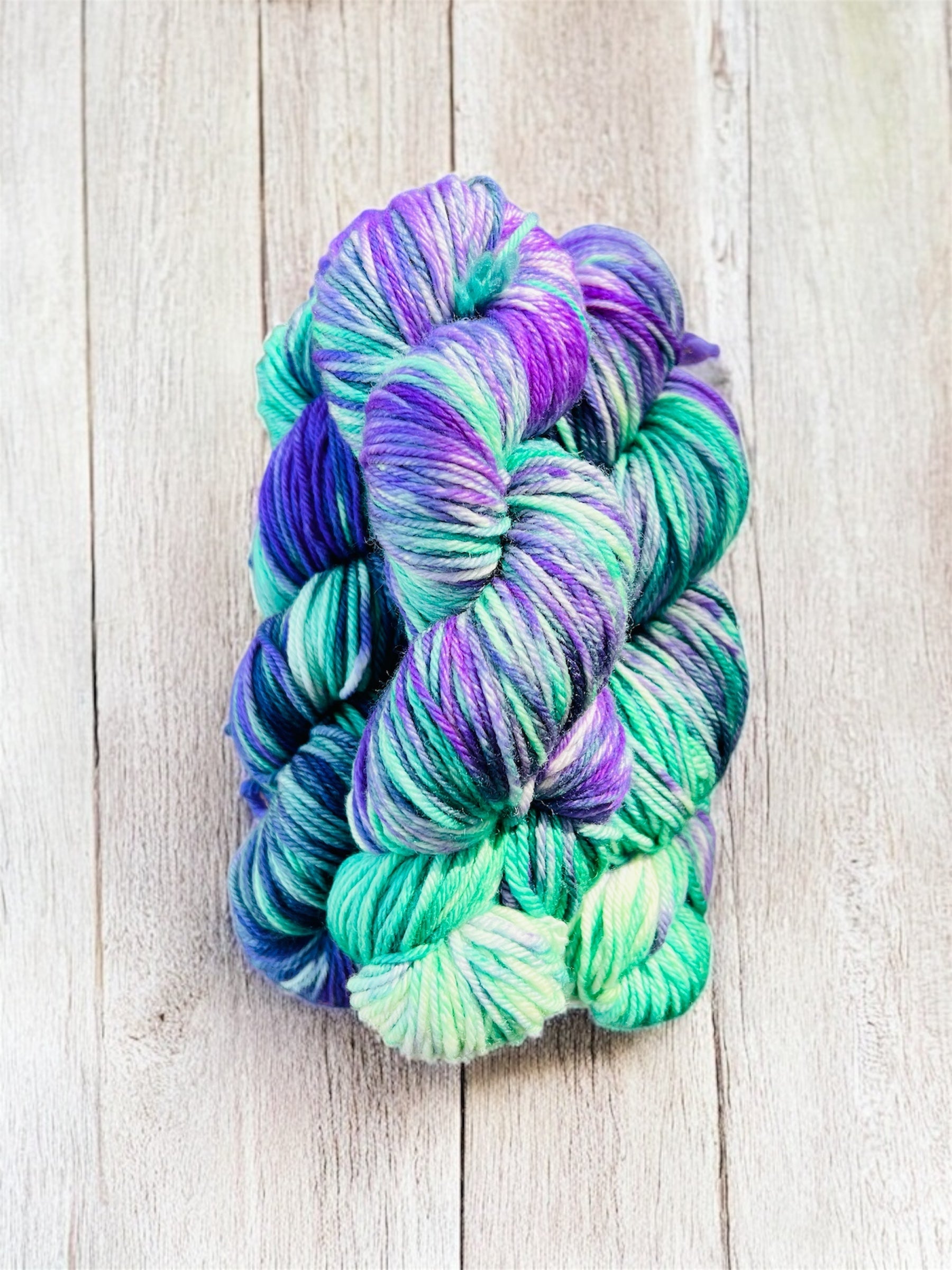 Country Iris is a colour way inspired by the beautiful Iris flowers grown in our garden, a a blend of rich purple and green each skein is hand dyed in my studio on our small farm in Bagdad, Tasmania