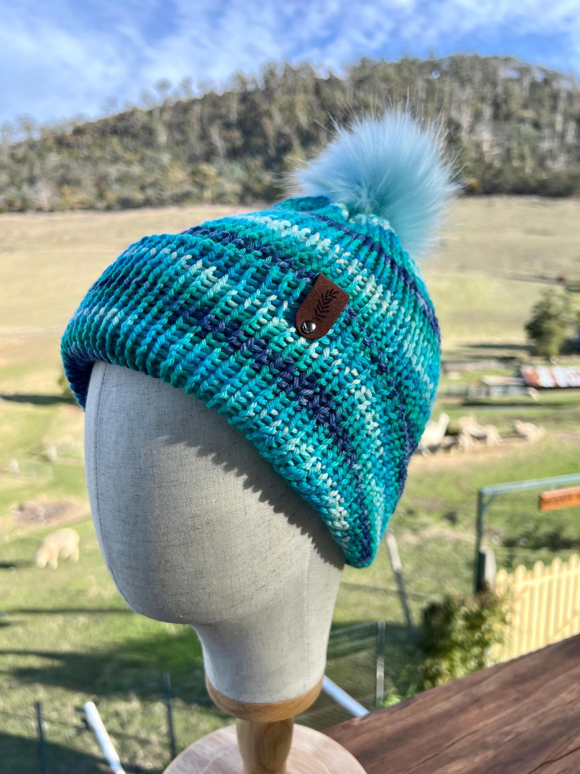 This Beanie has been knitted with yarn that we have hand dyed on our farm, in Tasmania, Australia.