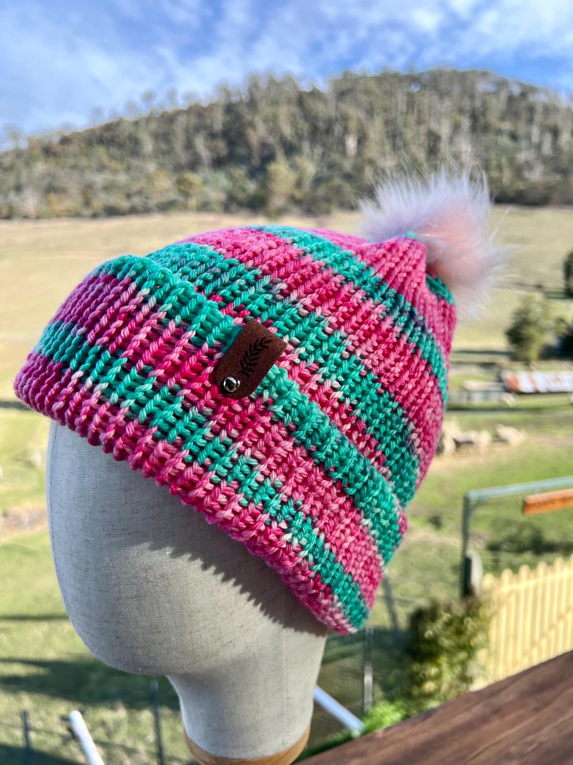 This Beanie has been knitted with yarn that we have hand dyed on our farm, in Tasmania, Australia.
