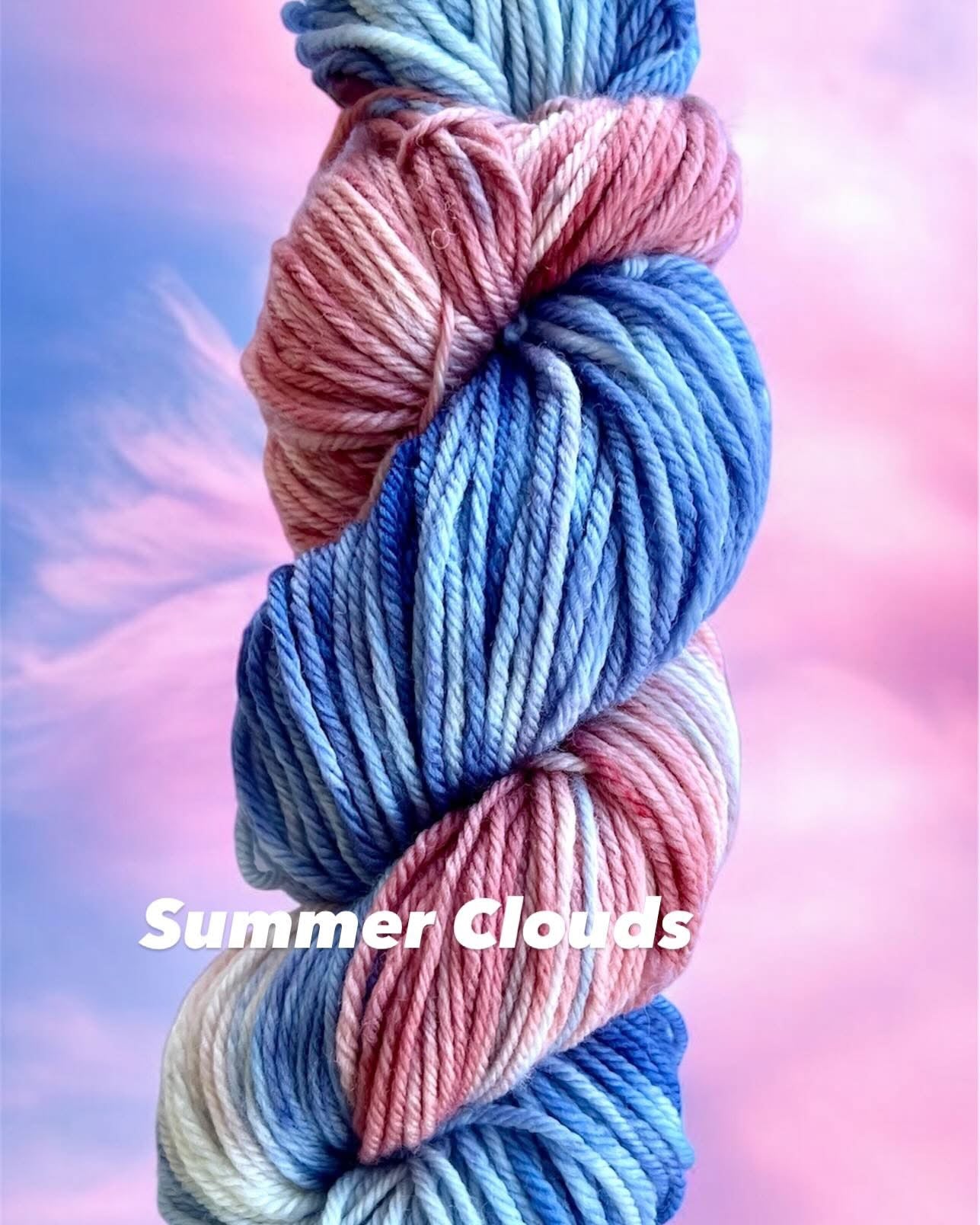 Summer Clouds is blend of blues and pinks representing the afternoon skies across our small farm in Summer, each skein is hand dyed in my studio on our small farm in Bagdad, Tasmania.