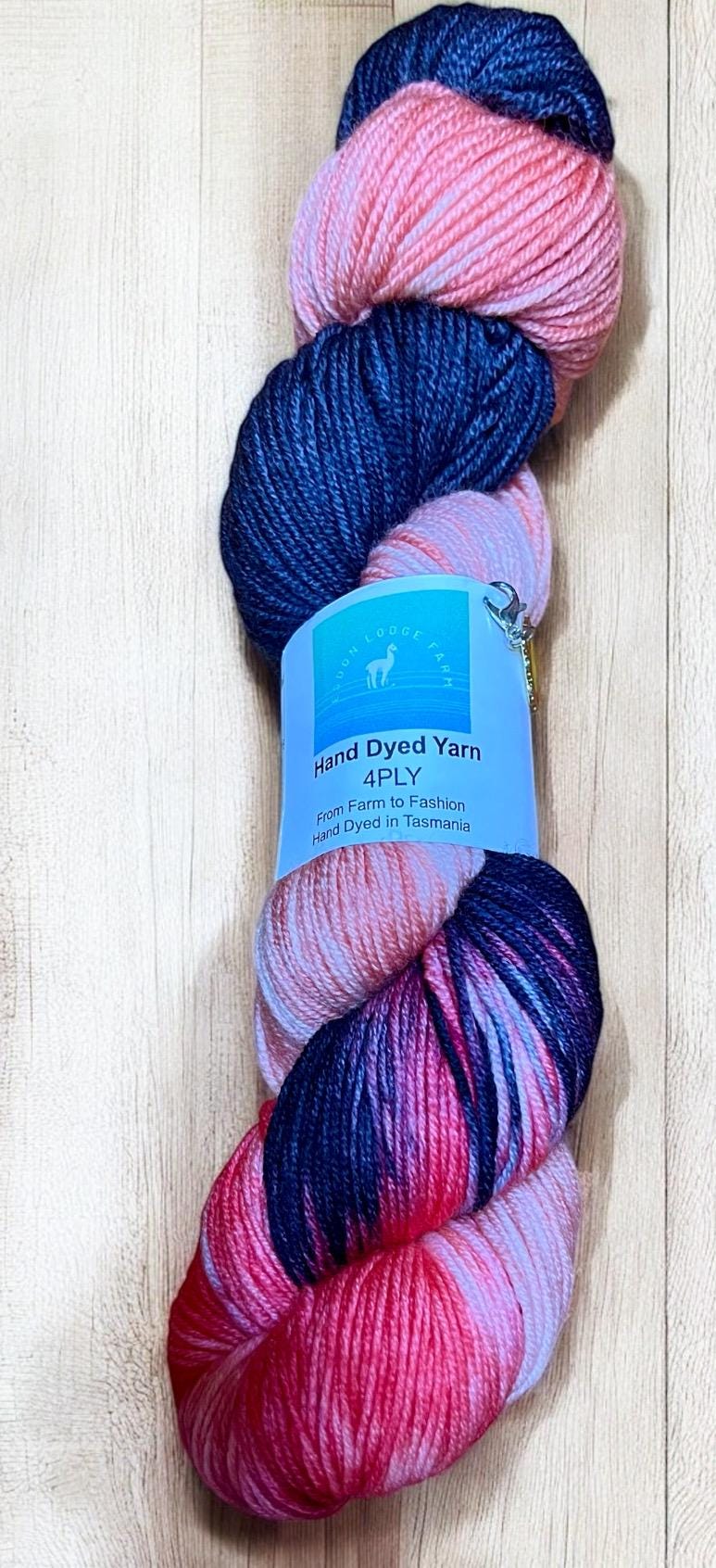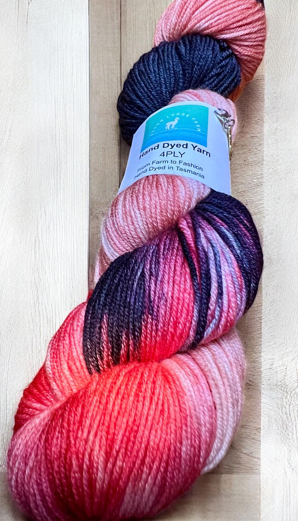Summer Sunset is a lovely blend of Rich Red, orange , black and grey each skein is hand dyed in my studio on our small farm in Bagdad, Tasmania.