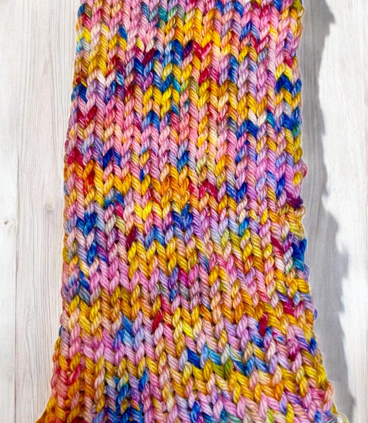 Fruit Tingle is a multi colour blend and each skein is hand dyed in my studio on our small farm in Bagdad, Tasmania.